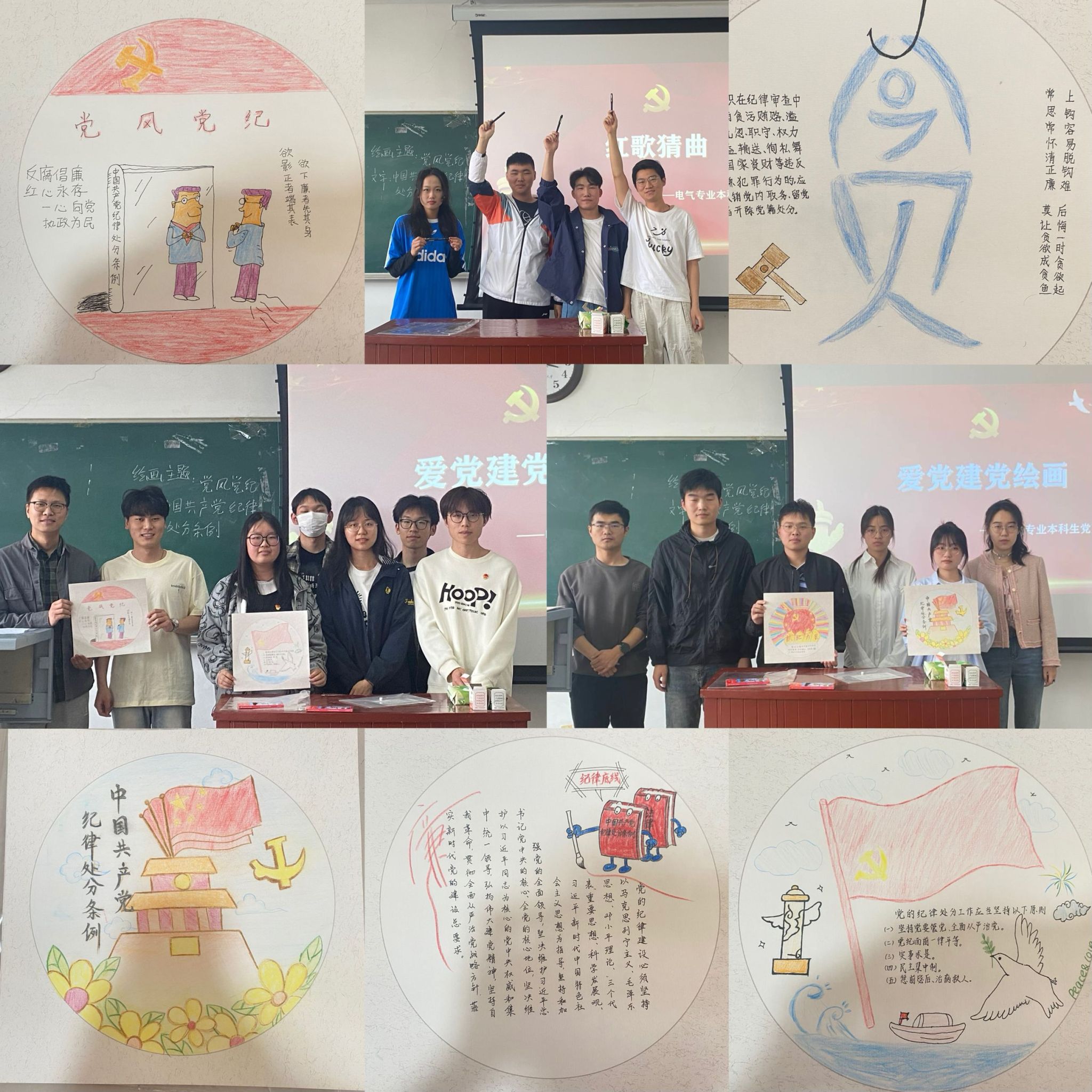 活动伊始,支部成员进行了分组。首先进行的是“党风党纪”主题绘画,支部成员通过学习《中国共产党纪律处分条例》,在学习我党坚强的党性、优良的党风、严明的党纪的同时,加入自己的理解,完成了一幅又一幅富有创意的绘画作品。猜红歌环节,第一首红歌的曲调一出现,支部成员们马上抢答说出了歌名。随后几首红歌也是刚播放了一小段,就有许多同志抢答,现场气氛热烈,大家纷纷参与进来,昂扬的曲声、抢答的呼声、欢快的笑声充满了整个教室。一首首红色经典歌曲,带领大家重温了党的奋斗百年路