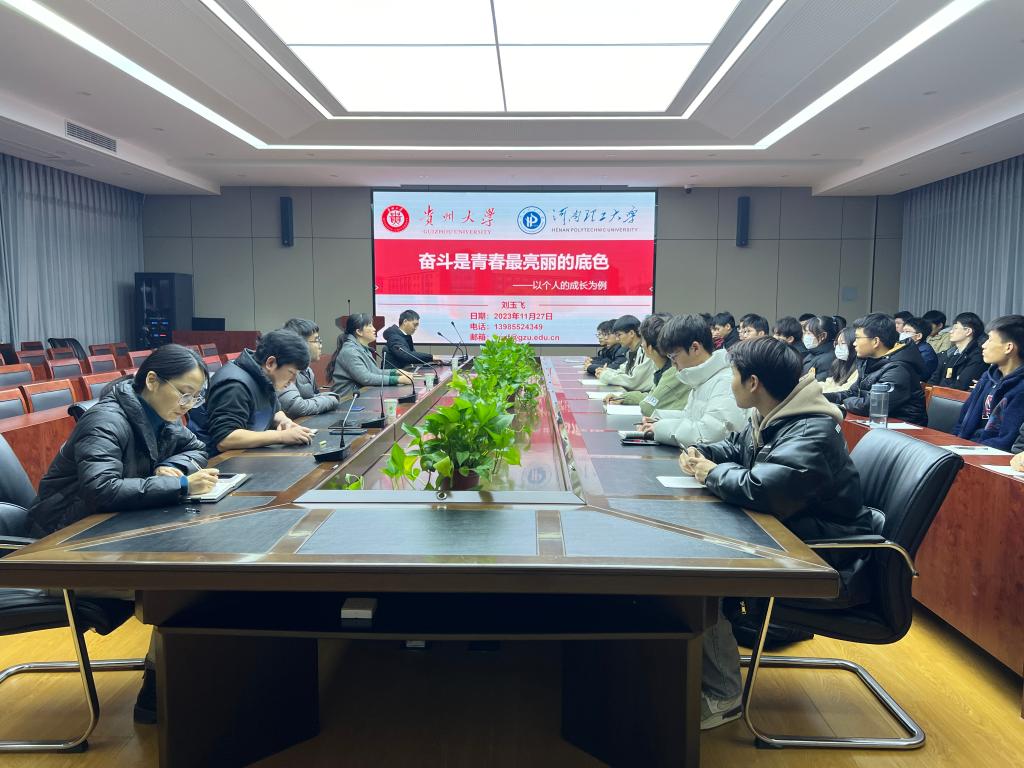 11月27日下午,电气学院主办的“电气红色大讲堂”——优秀校友进校园系列活动在电气101举行。贵州大学特聘教授刘玉飞(材料科学与工程专业2009级校友)受邀以《奋斗是青春最亮丽的底色》为题作专题报告。学院党委副书记朱伶俐、学工办、团委负责老师参加了报告会,该院百余名学生干部代表聆听了报告。