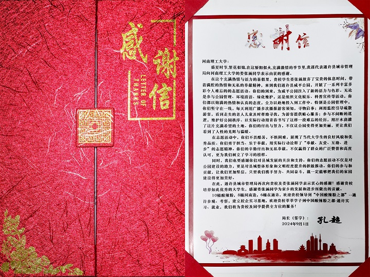 榜样如灯塔,照亮前行路。近日,电气学院收到了来自河南省开封市通许县城市管理局的感谢信,对学院自动化2303班娄张涵同学在暑期的志愿活动表示高度赞扬。