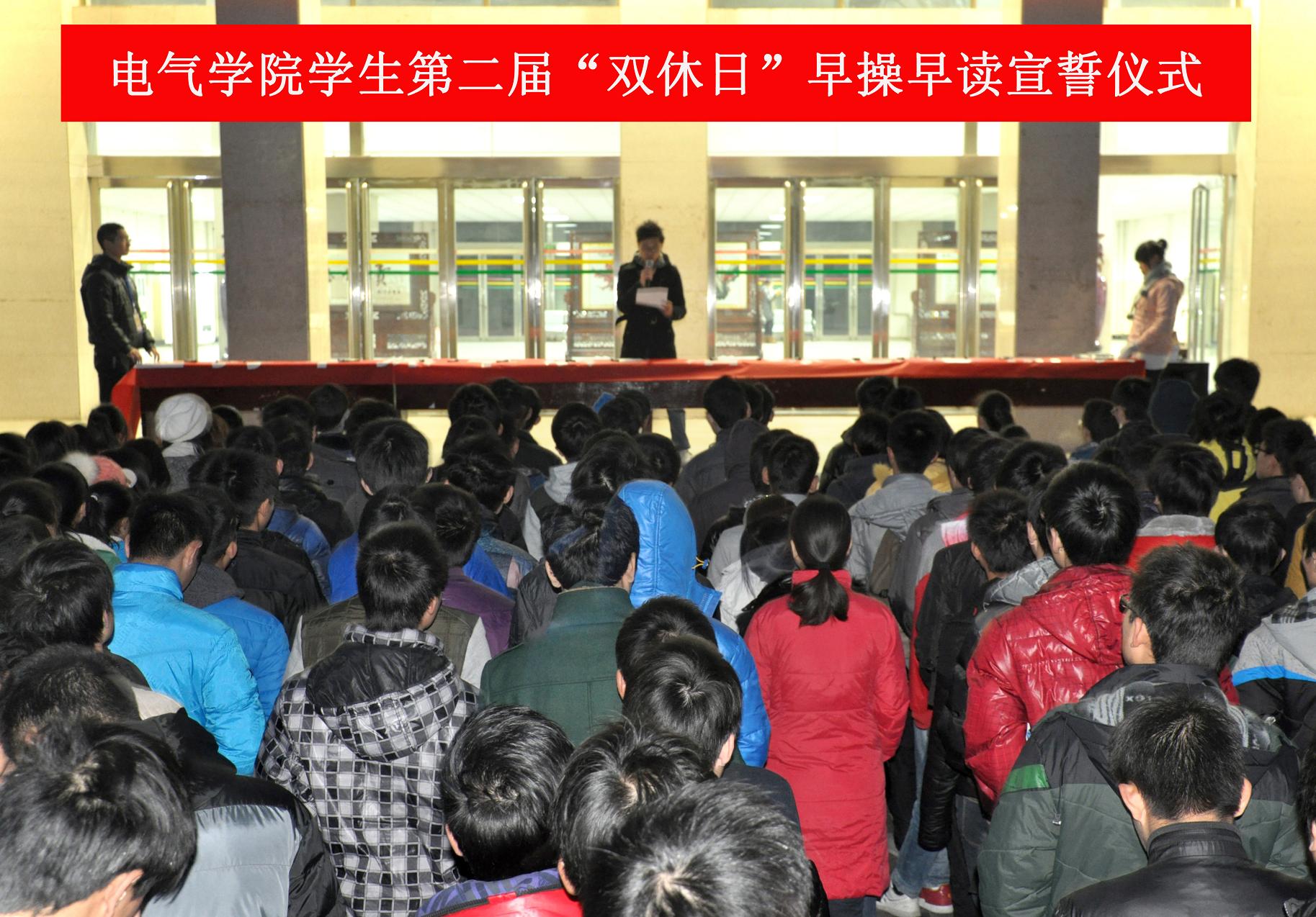 11月30日上午6:30,电气学院2013级学生自发组织的第二届“双休日”早操早读宣誓仪式在三号教学楼前举行。该院2013级459名自愿参加“双休日”早操早读学生参加宣誓仪式。
