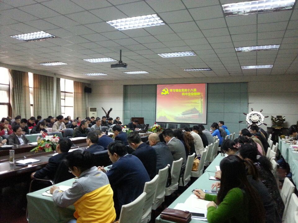 会上,我党委中心组成员和全体教职工认真学习了《中国共产党第十八届中央委员会第四次全体会议公报》原文。大家还一起了解了十八届四中全会的主要议程和召开情况。重点对《公报》提出的:“建设中国特色社会主义法治体系,建设社会主义法治国家”的总目标、“完备的法律规范体系、高效的法治实施体系、严密的法治监督体系、有力的法治保障体系、完善的党内法规体系”的全面推进依法治国五个体系和“完善以宪法为核心的中国特色社会主义法律体系,加强宪法实施;深入推进依法行政,加快建设法治政府;保证公正司法,提高司法公信力;增强全民法治观念,推进法治社会建设;加强法治工作队伍建设;加强和改进党对全面推进依法治国的领导”的全面依法治国六项重大任务进行了学习讨论。