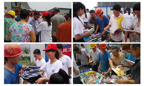 7月20日,电气学院大学生暑期社会实践“关爱农民工”志愿服务队在院团委老师的带领下,来到“建业公园里”建筑工地为农民工免费发放书籍和衣物,本次所发放物品均来自社会各界爱心人士的捐赠。