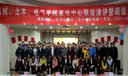 11月29日晚,我院宣传中心与机械、土木宣传中心在大学生活动中心招聘大厅二楼举办联谊活动。此次活动以演讲、朗诵比赛的形式开展,旨在激发学生演讲朗诵热情,促进个各宣传中心的合作与交流。机械学院宣传中心指导老师胡相忠及各学院宣传中心成员参加了此次活动,活动还邀请了校演讲与辩论协会会长王雨婷、校大通社社长曹善鹏担任比赛的评委。