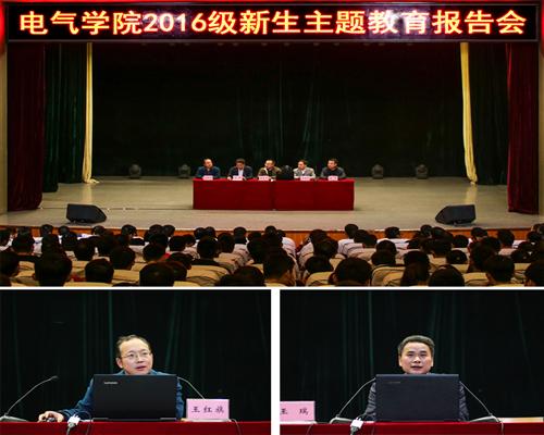 为了使16级新生能够更快的转变角色,更好的适应大学生活,引导学生树立远大目标,坚定理想信念,10月27日晚,电气学院2016级新生主题教育报告会在小礼堂如期举办。学院党政领导康全玉、王福忠、王瑞、钱伟、王红旗,16级辅导员及全体16级新生参加了报告会。会议由王瑞主持。