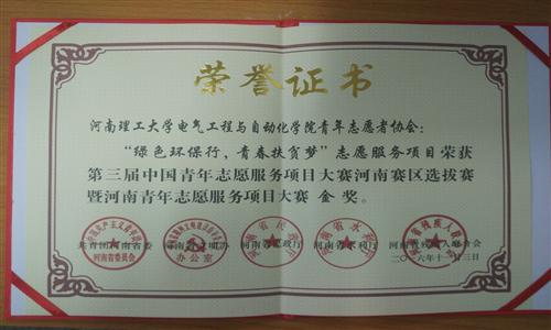 近日,第三届中国青年志愿服务项目大赛暨志愿服务宁波交流会在宁波举行。由河南理工大学电气学院团委指导,电气学院青年志愿者协会具体实施的志愿服务项目《绿色环保行,青春扶贫梦》获得河南省金奖,并从全国4049个项目中脱颖而出,荣获全国铜奖。
