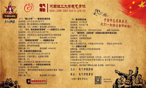 今年3月5日是全国第54个学雷锋纪念日,也是第17个中国青年志愿者服务日。为进一步弘扬和传承雷锋精神,加强学生思想道德教育,由我院团委主办,院青年志愿者协会承办的“学雷锋志愿者服务月”系列活动将于3月5日正式开始。
