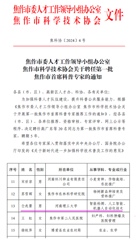 为贯彻落实中共中央办公厅、国务院办公厅印发的《关于新时代进一步加强科学技术普及工作的意见》和焦作市科技创新委员会的《焦作市支持加强科学普及提升全民科学素质的若干政策措施》,壮大科普专家人才队伍,2024年2月28日,焦作市委人才工作领导小组办公室、焦作市科学技术协会发布关于聘任第一批焦作市首席科普专家的通知,我院教师仝兆景成功入选。