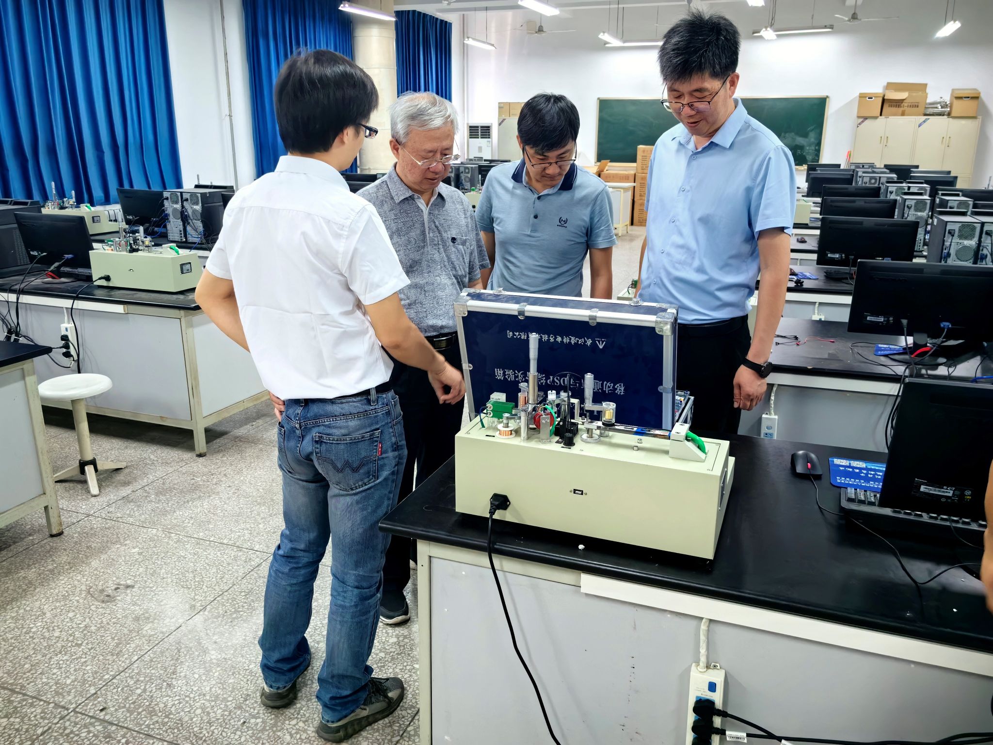 戴胜华教授一行首先来到我院国家级电工电子实验教学示范中心参观,实验中心常务副主任李玉东对实验中心的发展历程、实验设备、实验教学组织、大学生创新活动等进行了介绍。随后,重点考察了轨道交通信号与控制专业实验室,张宏伟就专业实验室建设、实验教学改革的思路、做法以及取得的成效进行了详细介绍。戴胜华教授一行对我院实验教学环境、办学条件予以了高度称赞。