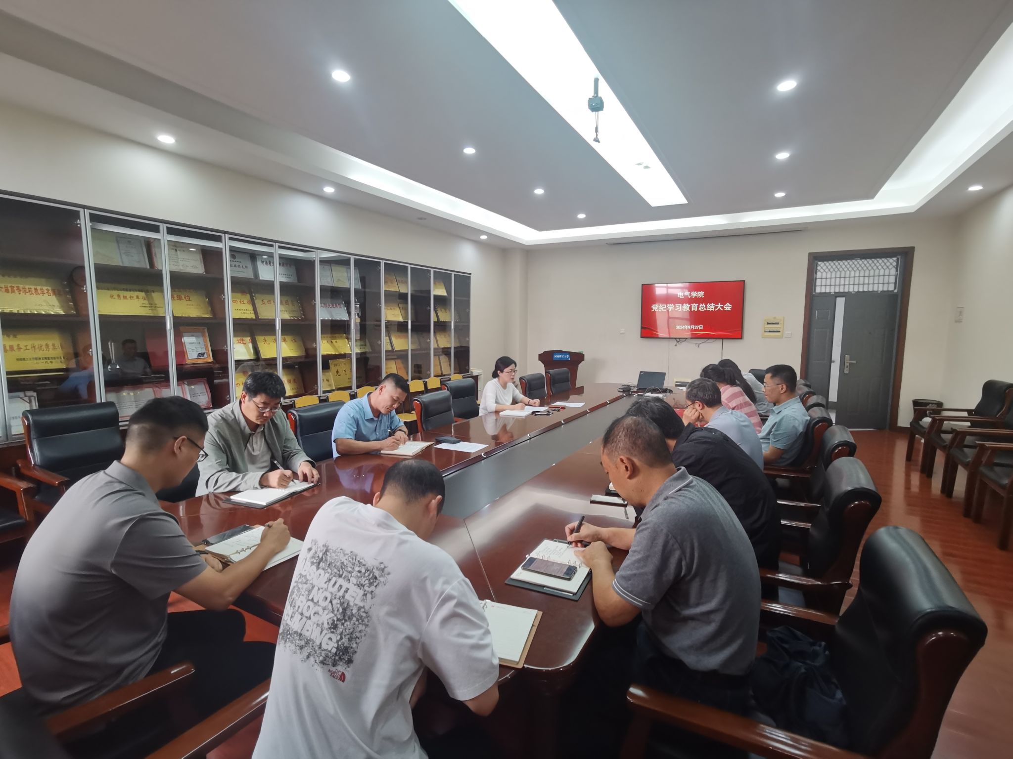 9月27日下午,电气学院在学院215会议室召开党委扩大会议,全面总结学院党纪学习教育,研究部署推进党纪学习教育常态化长效化工作。该院党委书记李慧敏主持会议并讲话,党委委员、各教工党支部书记、各科室负责人参加会议。