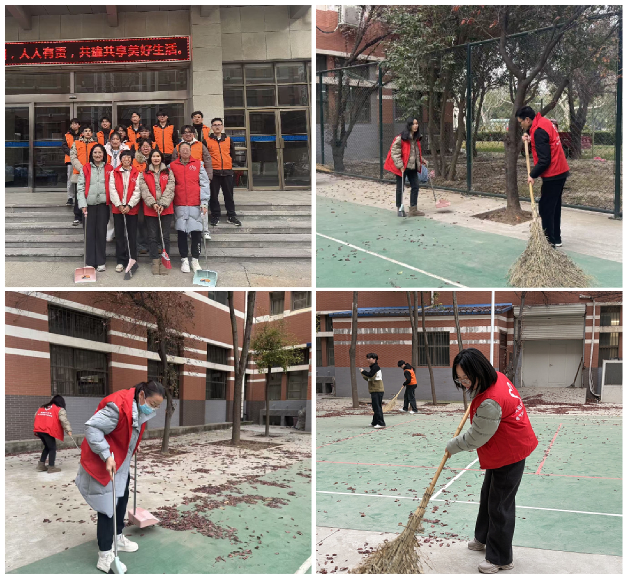 活动现场,老师们与班长联席会分工协作、热情高涨,手持扫帚、簸箕等清洁工具,重点对排球场内的落叶、杂物进行集中清理。大家不怕脏、不怕累,仔细清扫场地的每一个角落,经过一番努力,排球场内的落叶基本清理干净,场地环境焕然一新,整体面貌得到显著提升。
