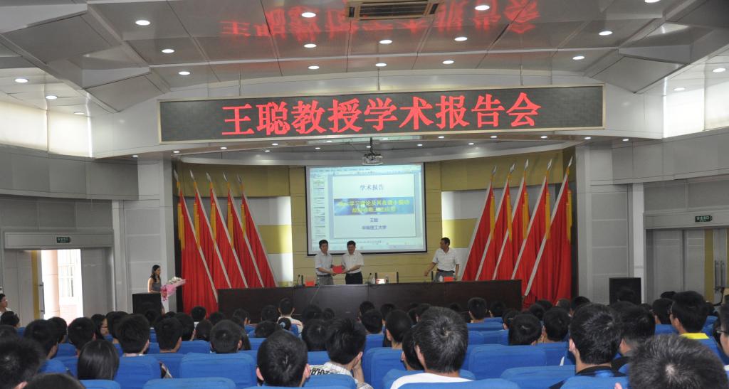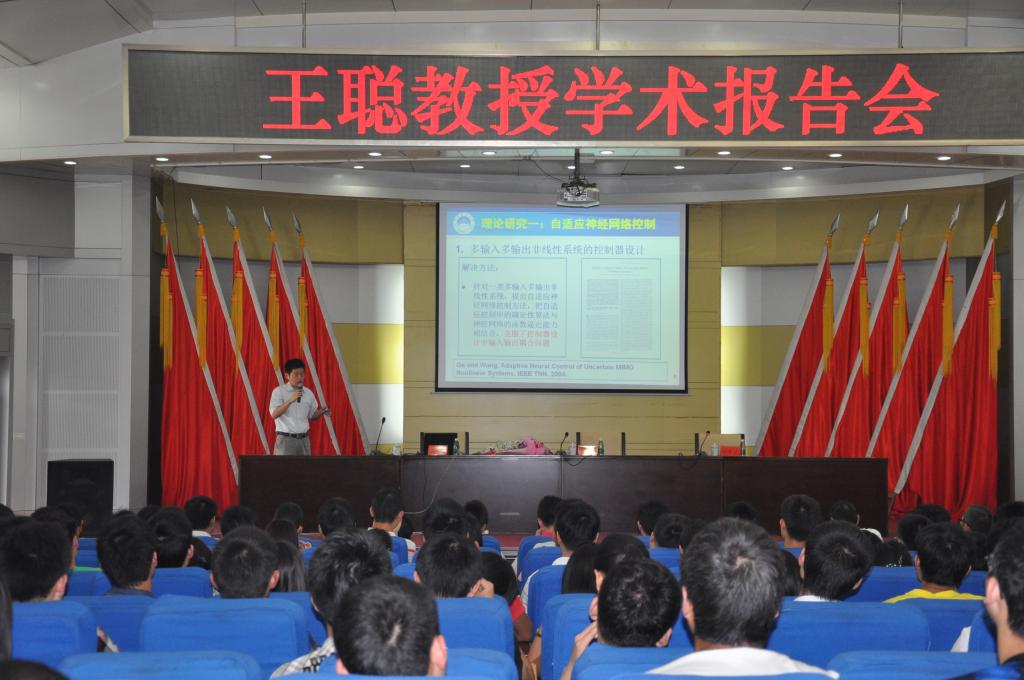 2013年6月13号下午,国家杰出青年科学基金获得者、教育部新世纪优秀人才、智能控制领域知名专家华南理工大学王聪教授受聘我校兼职教授并在力行楼学术报告厅做专题学术报告。校长邹友峰出席聘任仪式并为王聪教授颁发聘书,电气学院300余名师生参加了学术报告会。报告会由电气工程与自动化学院院长付子义主持。