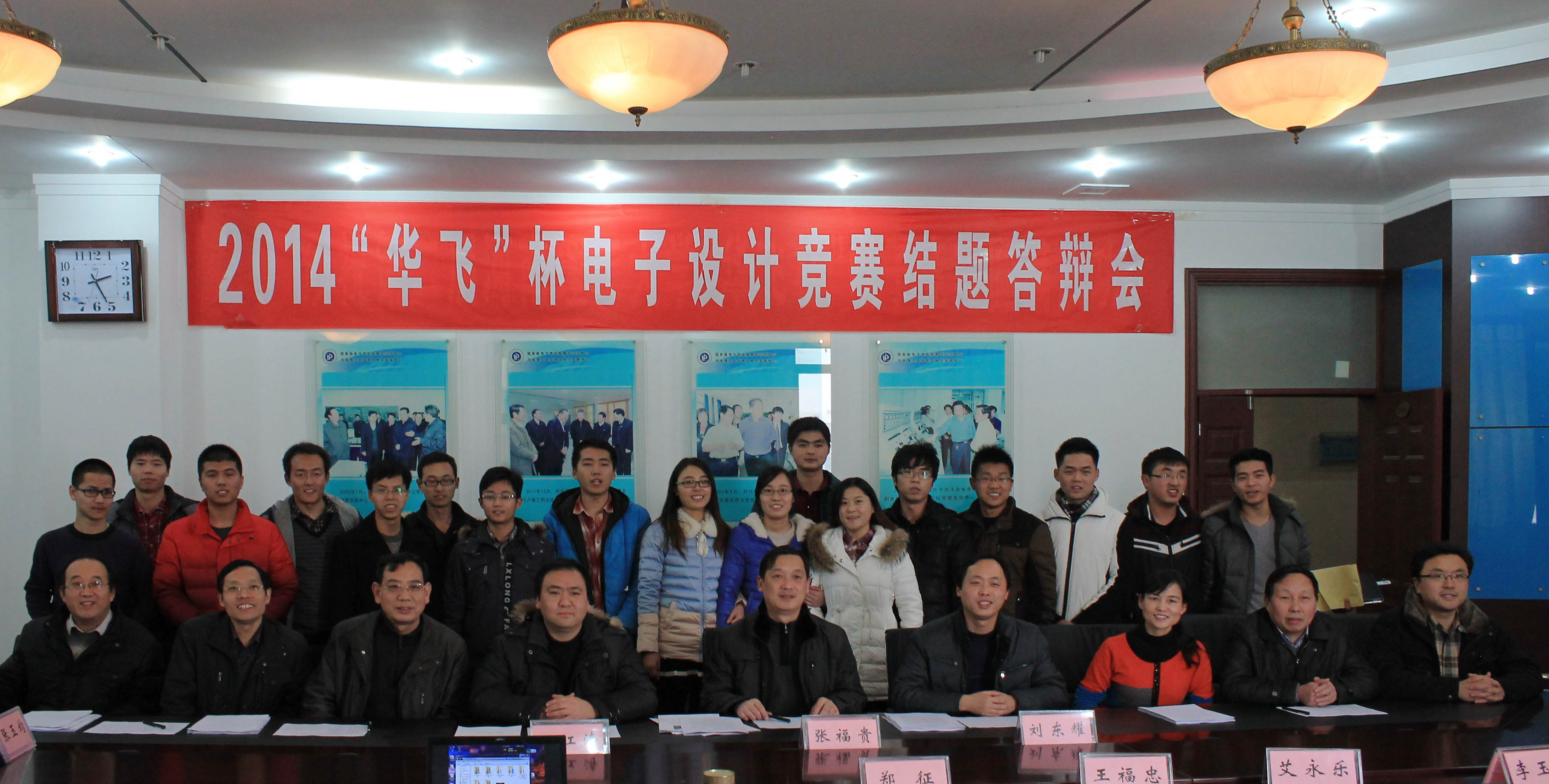 2014年12月26日上午,电气学院主办的“2014第三届“华飞杯”电子设计竞赛结题答辩会在校国家级电工电子实验示范中心成功举行。通过初期检查和中期赛选的激烈竞争,来自电气学院的硕士研究生和本科生组成的13队伍共计42名同学最终参加了此次结题答辩会。焦作市华飞电子电器股份有限公司3位总工和电气学院12位专家、教授担任了本次结题答辩会的评委。